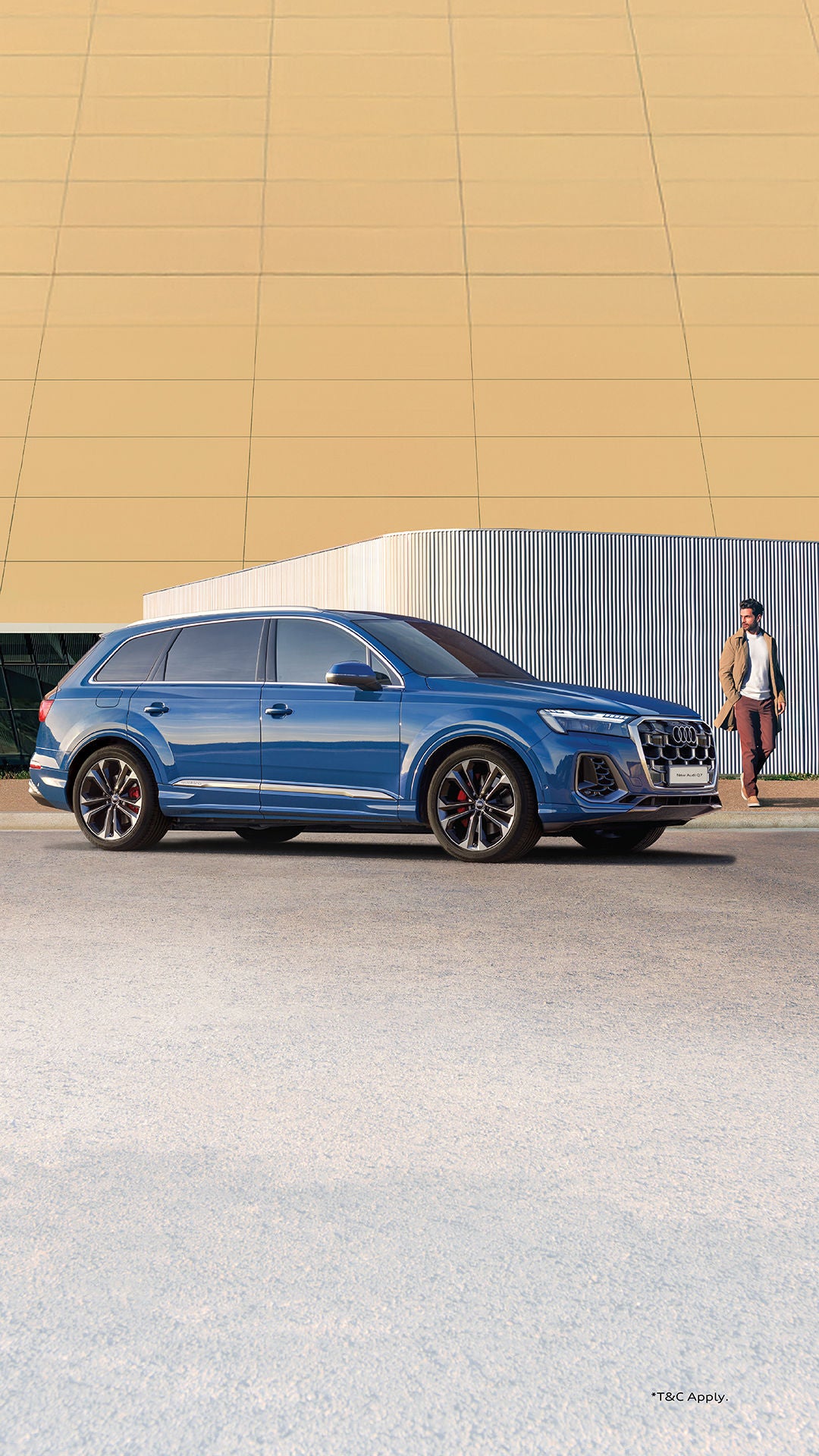 The new Audi Q7 SUV displays its off-road DNA with classic quattro architecture and a powerful shoulder line. The striking Audi Singleframe, Audi rings in flat 2D look, all contribute to its sporty appearance.